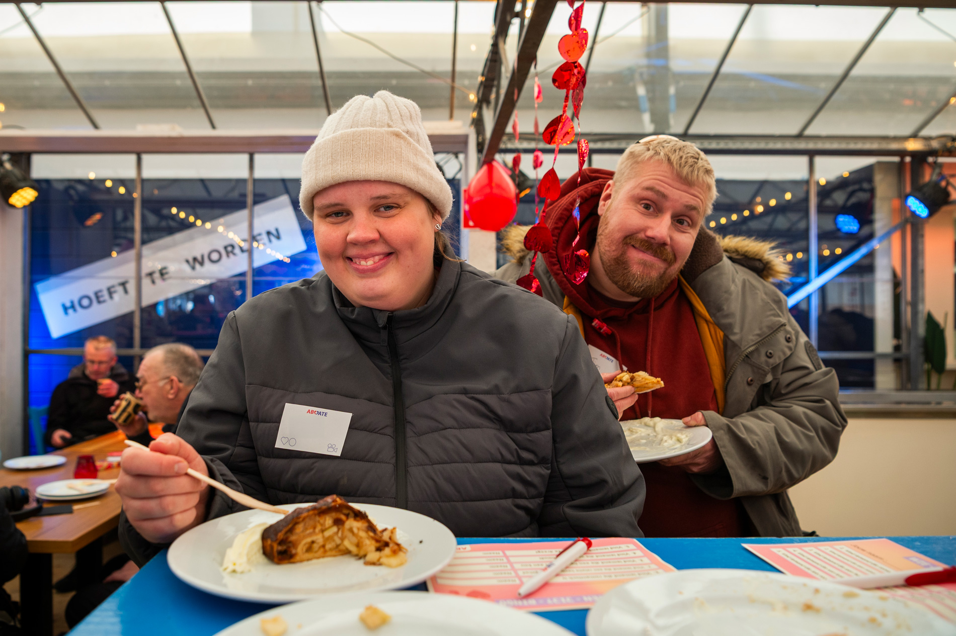 Aan een lange tafel met koffie en appeltaart staan Gerda en Wilma. Ze zijn vrijwilliger bij ABCDate en kijken trots naar de groep.